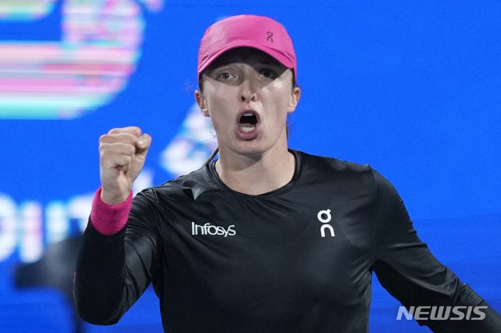 [두바이=AP/뉴시스] 이가 시비옹테크(1위·폴란드)가 21일(현지시각) 아랍에미리트(UAE) 두바이에서 열린 두바이 듀티프리챔피언십 단식 16강전에서 엘레나 스비톨리나(20위·우크라이나)를 물리친 후 환호하고 있다. 이 대회에서 우승한 적이 없는 시비옹테크가 2-0(6-1, 6-2)으로 승리하고 8강에 올라 호주오픈 준우승자인 정친원(7위·중국)과 맞붙는다. 2024.02.22.
