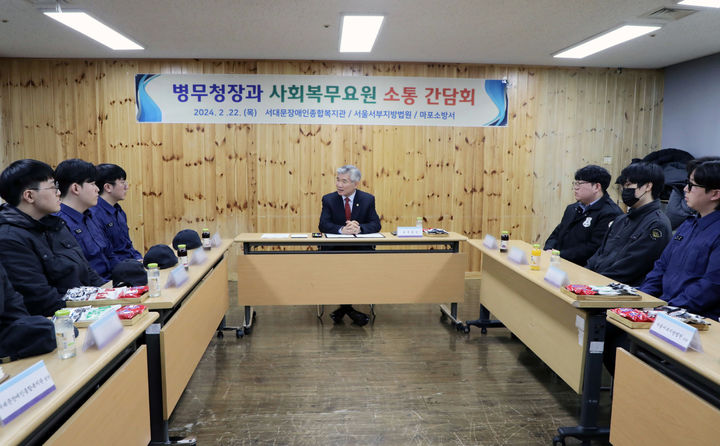 [서울=뉴시스] 고승민 기자 = 이기식 병무청장이 22일 오후 서대문장애인종합복지관을 방문해 복무 중인 사회복무요원들과 간담회를 하고 있다. (사진=병무청 제공) 2024.02.22. [email protected] *재판매 및 DB 금지