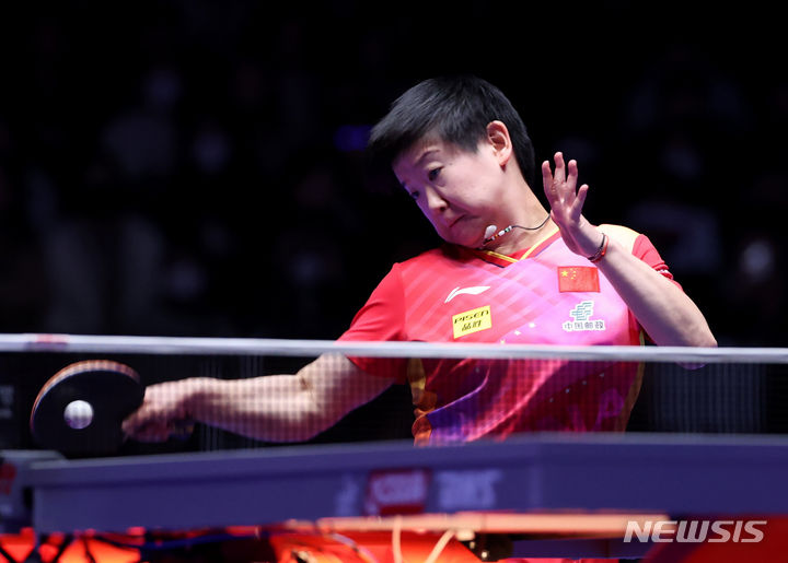 [부산=뉴시스] 김진아 기자 = 22일 부산 해운대구 벡스코에서 열린 BNK부산은행 2024 부산세계탁구선수권대회 여자 8강 한국과 중국의 경기, 순잉샤가 이시온을 상대로 경기를 펼치고 있다. 2024.02.22. [email protected]