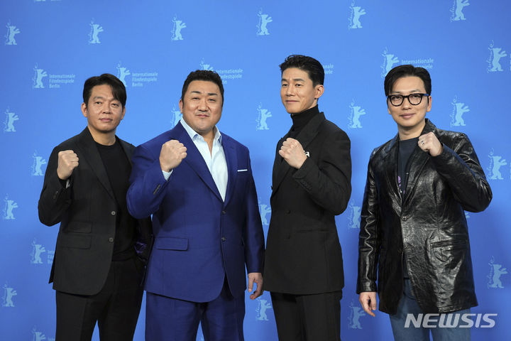 [베를린=AP/뉴시스] 영화 '범죄도시4' 출연진이 23일(현지시각) 독일 베를린에서 열린 제74회 베를린영화제 스페셜 갈라 부문 초청작 '범죄도시4' 포토콜 행사에 참석해 포즈를 취하고 있다. 왼쪽부터 박지환, 마동석, 김무열, 이동휘. 2024.02.24.