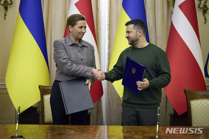 [르비우=AP/뉴시스] 우크라이나 대통령 공보실이 제공한 사진에 볼로디미르 젤렌스키(오른쪽) 우크라이나 대통령이 23일(현지시각) 르비우에서 메테 프레데릭센 덴마크 총리와 협정서에 서명 후 악수하고 있다. 2024.02.24.