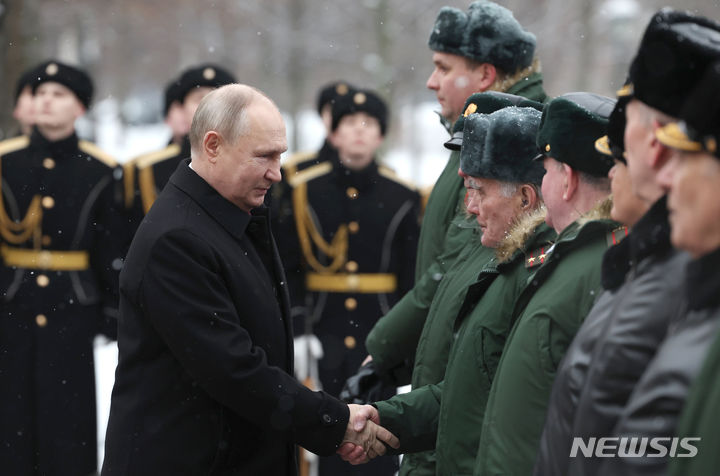 [모스크바=AP/뉴시스] 블라디미르 푸틴(왼쪽) 러시아 대통령이 23일(현지시각) '조국 수호자의 날'을 맞아 모스크바에 있는 무명용사 묘지 헌화식에 참석해 육군 참전용사들과 악수하고 있다. 2024.02.24.