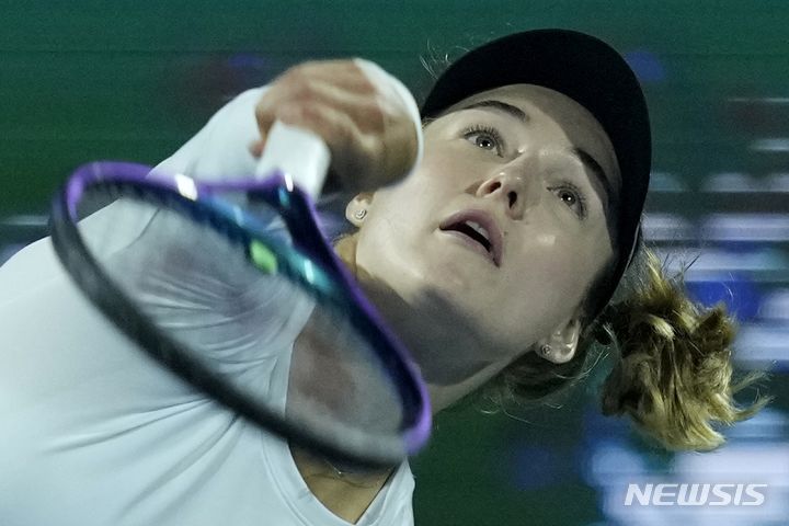 [두바이=AP/뉴시스] 안나 카린스카야(40위·러시아)가 23일(현지시각) 아랍에미리트(UAE) 두바이에서 열린 두바이 듀티프리챔피언십 단식 준결승에서 이가 시비옹테크(1위·폴란드)와 경기하고 있다. 카린스카야가 2-0(6-4 6-4)으로 승리하고 결승에 올라 자스민 파올리니(26위·이탈리아)와 우승을 다툰다. 2024.02.24.