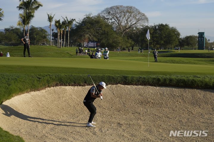 [푸에르토 바야르타=AP/뉴시스] 이경훈이 23일(현지시각) 멕시코 푸에르토 바야르타의 비단타 바야르타 GC에서 열린 미국프로골프(PGA) 투어 멕시코 오픈 2라운드 10번 홀 벙커에서 샷하고 있다. 최근 두 경기에서 컷 탈락한 이경훈은 중간 합계 1오버파 143타 공동 86위로 또다시 컷 탈락했다. 2024.02.24.