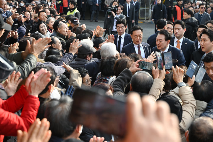 [서울=뉴시스] 윤석열 대통령이 26일 충남 서산 동부전통시장을 방문해 시민들과 악수하고 있다. (사진=대통령실 제공) 2024.02.26. [email protected] *재판매 및 DB 금지