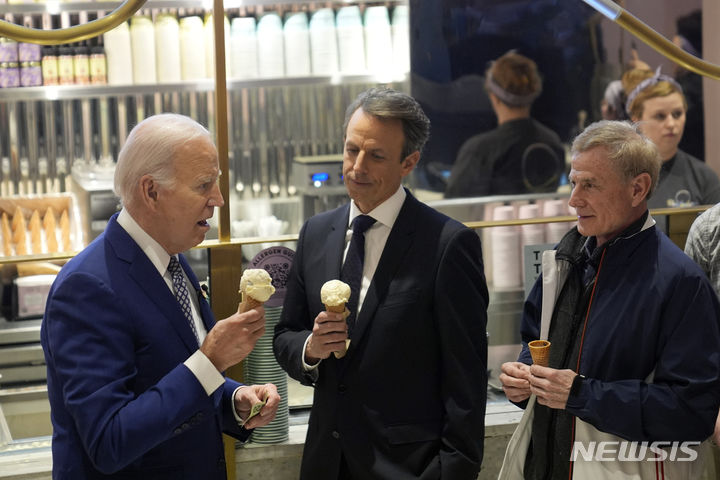 [뉴욕=AP/뉴시스] 조 바이든(왼쪽) 미국 대통령이 26일(현지시각) 미국 뉴욕의 디저트 맛집 '반 리우웬 아이스크림'에서 심야 토크쇼 '레이트 나이트' 진행자 세스 마이어스와 함께 아이스크림을 먹고 있다. 2024.02.27.