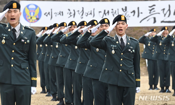 [광주(경기)=뉴시스] 김종택 기자 = 29일 경기도 광주시 오포읍 특수전학교에서 열린 '특전부사관 55기 1차 임관식'에서 특전부사관들이 경례하고 있다. 2024.02.29. [email protected]