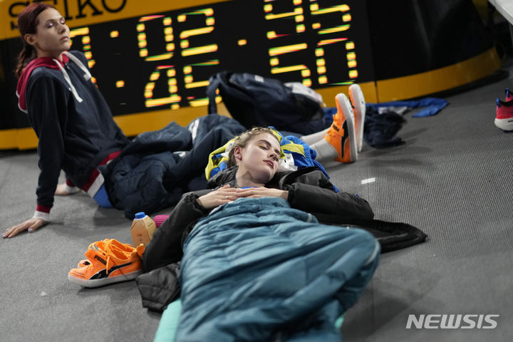 [글래스고=AP/뉴시스] 야로슬라바 올렉시이우나 마후치흐(우크라이나)가 1일(현지시각) 영국 스코틀랜드 글래스고의 에미레이트 아레나에서 열린 2024 세계실내육상선수권대회 여자 높이뛰기 경기를 앞두고 휴식하고 있다. 디펜딩 챔피언 마후치흐는 결선에서 1m97을 넘어 2위를 기록했다. 2024.03.02.