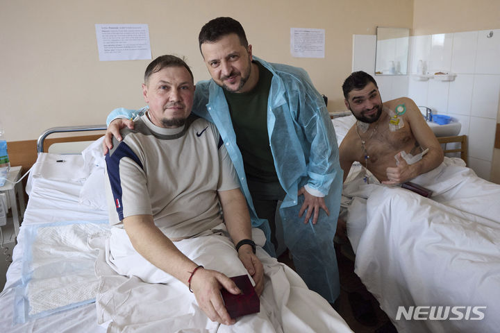 [하르키우=AP/뉴시스] 우크라이나 대통령 공보실이 제공한 사진에 볼로디미르 젤렌스키(가운데) 대통령이 1일(현지시각) 하르키우의 병원을 방문해 부상한 우크라이나 군인들을 표창한 후 기념 촬영하고 있다. 2024.03.02.