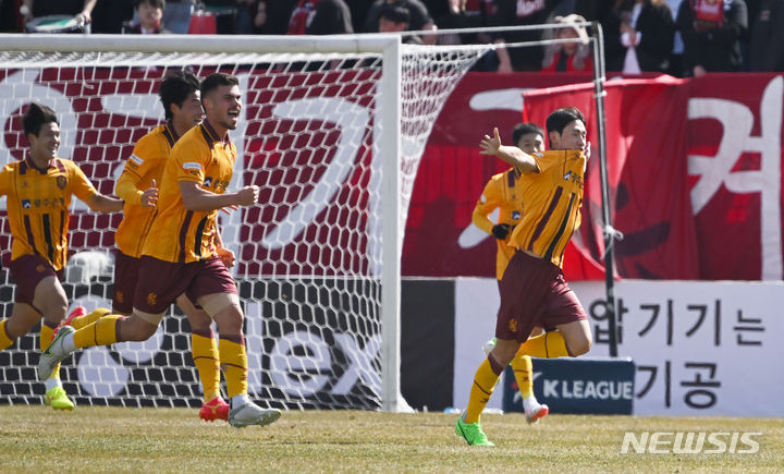 [광주=뉴시스] 이영주 기자 = 2일 오후 광주 서구 광주축구전용구장에서 열린 하나원큐 K리그1 2024 1라운드 광주FC와 서울FC의 경기, 전반 20분 광주FC 이희균이 득점 세리머니를 하고 있다. 2024.03.02. [email protected]