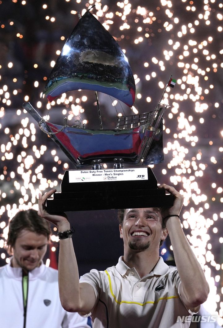 [두바이=AP/뉴시스] 우고 움베르(18위·프랑스)가 2일(현지시각) 아랍에미리트 두바이에서 열린 남자프로테니스(ATP) 투어 ATP500 두바이 듀티프리 챔피언십 단식 정상에 올라 트로피를 들어 올리고 있다. 움베르는 결승에서 알렉산더 부브릭(23위·카자흐스탄)을 2-0(6-4 6-3)으로 꺾고 투어 6승째를 올렸다. 2024.03.03.