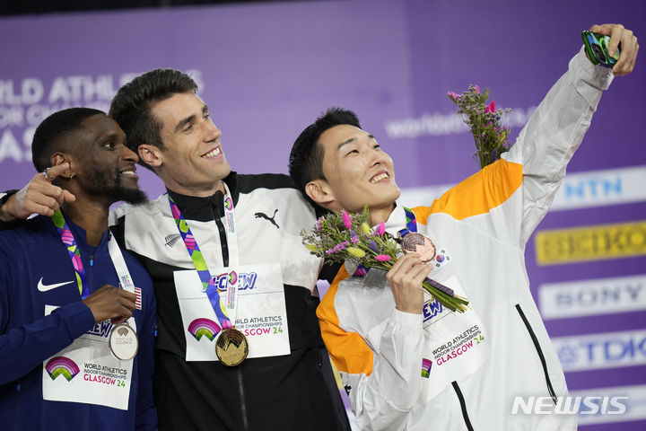 [글래스고=AP/뉴시스] 우상혁(오른쪽)이 3일(현지시각) 영국 스코틀랜드 글래스고의 에미레이트 아레나에서 열린 2024 세계실내육상선수권대회 남자 높이뛰기에서 동메달을 목에 걸고 수상자들과 셀카를 찍고 있다. 우상혁은 2m28을 뛰어넘어 3위를 기록했다. 2024.03.04.
