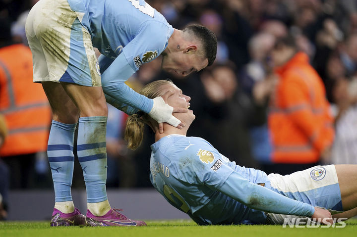 [맨체스터=AP/뉴시스] 맨체스터 시티의 엘링 홀란(오른쪽)이 3일(현지시각) 영국 맨체스터의 에티하드 스타디움에서 열린 2023-24 잉글랜드 프리미어리그(EPL) 27라운드 맨체스터 유나이티드와 경기 후반 추가 시간 팀의 세 번째 골을 넣은 후 필 포든과 기쁨을 나누고 있다. 맨시티는 포든의 멀티 골과 홀란의 쐐기 골을 묶어 3-1로 역전승하며 선두 리버풀을 승점 1점 차로 따라잡았다. 2024.03.04.