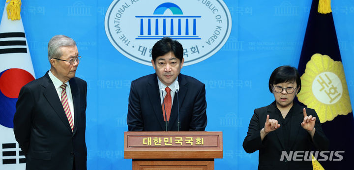 [서울=뉴시스] 고범준 기자 = 김범준 전 부산대학교 특임교수가 4일 오전 서울 여의도 국회 소통관에서 열린 개혁신당 영입 인재 발표 기자회견에서 발언하고 있다. 왼쪽은 김종인 개혁신당 공천관리위원장. 2024.03.04. [email protected]