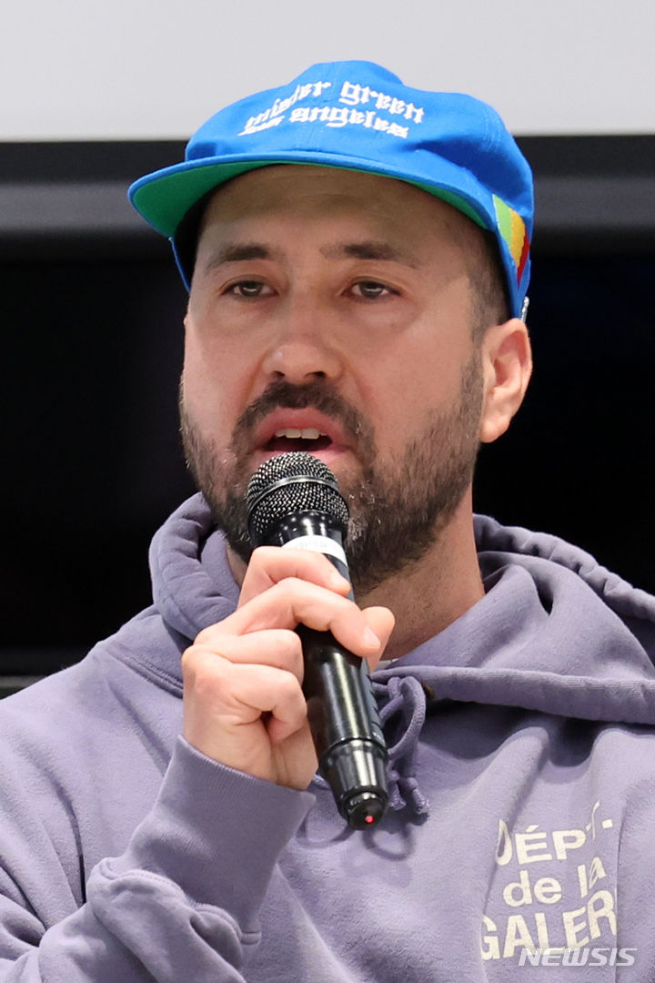 [서울=뉴시스] 박진희 기자 = 스티븐 해링턴 작가가 5일 서울 용산구 아모레퍼시픽미술관에서 개인전 'STEVEN HARRINGTON: STAY MELLO' 언론공개회를 하고 있다. 이번 개인전은 작가의 회화, 조각, 판화, 드로잉과 더불어 나이키, 크록스, 이케아 등 세계적인 브랜드와의 협업을 통해 제작된 디자인 작품까지 총 100여 점을 소개하고 있다. 이번 전시는 캘리포니아 풍경과 문화로부터 영향을 받은 각종 캐릭터가 혼재하는 다채로운 색감의 작업들이다. 시각적 즐거움을 선사하는 작품의 이면에는 작가가 오랜 시간에 걸쳐 고민해 온 삶의 균형, 불안, 잠재의식 등에 대한 사색이 담겨있다. 2024.03.05. [email protected]