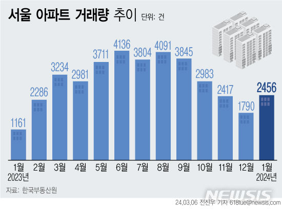 [서울=뉴시스] 6일 한국부동산원 통계에 따르면 지난 1월 서울 아파트 매매 거래량은 2456건으로 전달 1790건에 비해 37.2% 증가했다. (그래픽=전진우 기자)