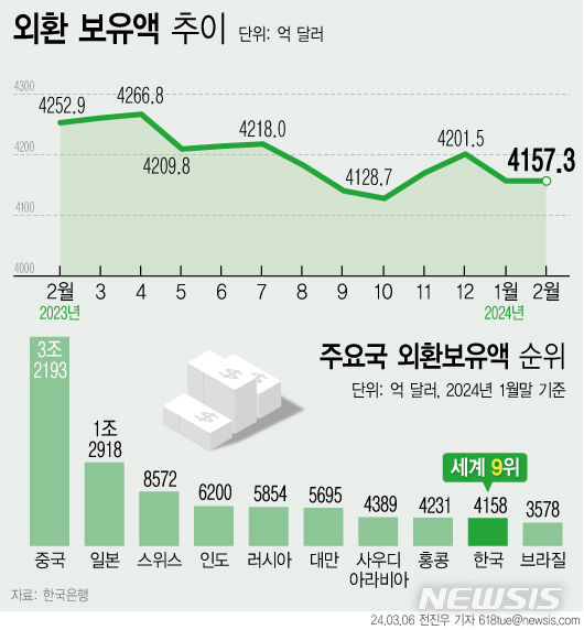 [서울=뉴시스] 6일 한국은행에 따르면 지난달 말 기준 외환보유액은 4157억3000만 달러로 전월말보다 3000만 달러 줄어 2개월 연속 하락했다. 미국 달러 가치 상승에 따른 기타통화 외화자산액 환산액이 감소하면서다. 전 세계 외환보유고는 홍콩에 밀려 6개월 연속 9위를 차지했다. (그래픽=전진우 기자)