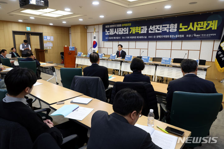 [서울=뉴시스] 조성봉 기자= 김문수 경제사회노동위원회 위원장이 6일 오전 서울 여의도 국회 의원회관 세미나실에서 열린 '노동시장의 개혁과 선진국형 노사관계' 대한민국헌정회 정책토론회에서 기조연설을 하고 있다. 2024.03.06. [email protected]