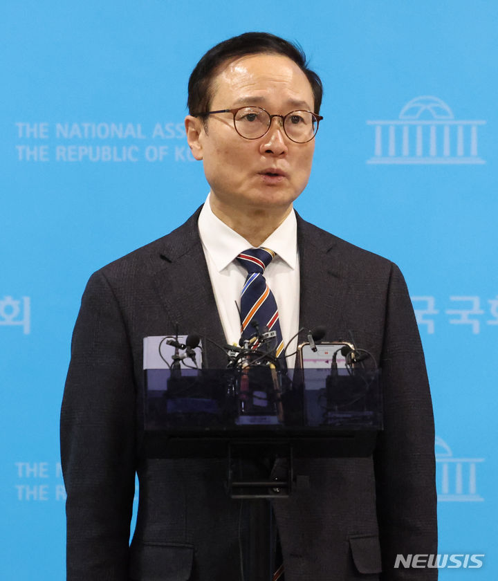 [서울=뉴시스] 추상철 기자 = 홍영표 더불어민주당 의원이 6일 오전 서울 여의도 국회에서 더불어민주당 탈당 기자회견을 마친 후 취재진의 질문에 답변하고 있다. 2024.03.06. [email protected]