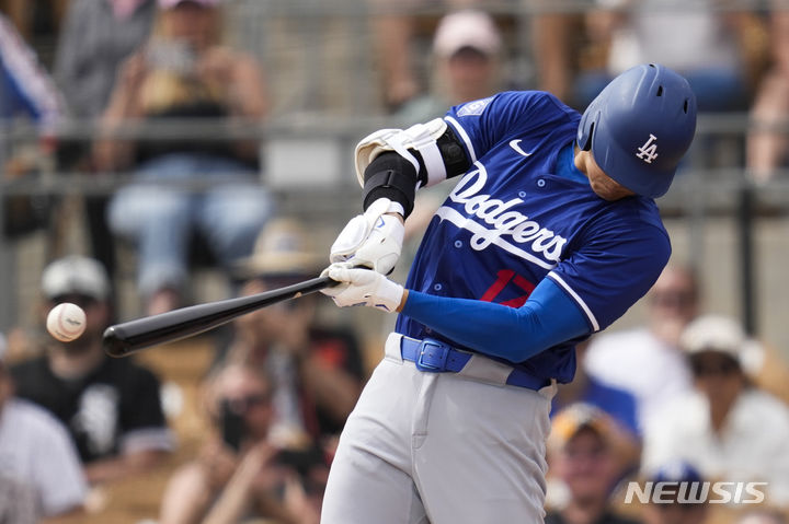 [피닉스=AP/뉴시스] 로스앤젤레스 다저스의 지명타자 오타니 쇼헤이가 6일(현지시각) 미 애리조나주 피닉스의 캐멀백 랜치에서 열린 2024 메이저리그(MLB) 시카고 화이트삭스와의 시범 경기 1회 안타를 치고 있다. 전날 무안타를 기록했던 오타니는 2타수 2안타 1득점 1타점 1도루를 기록하며 팀의 12-9 승리에 기여했다. 2024.03.07.