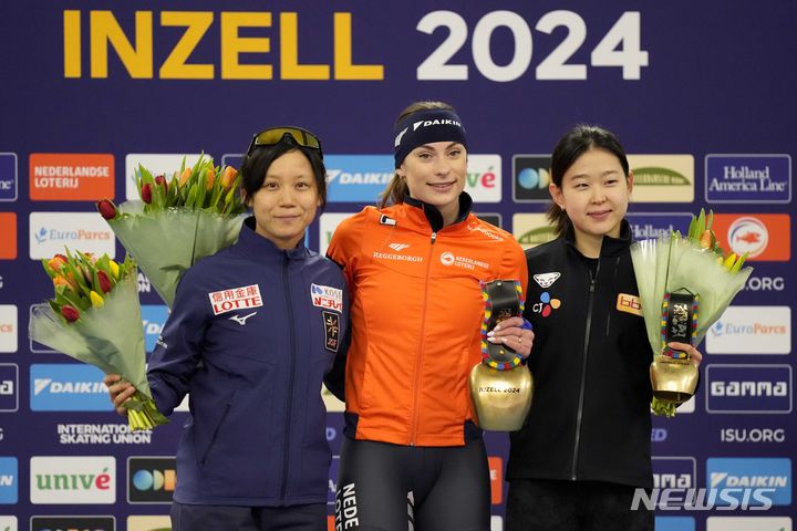 [인첼=AP/뉴시스] 김민선(오른쪽)이 7일(현지시각) 독일 인첼에서 열린 2024 국제빙상연맹(ISU) 스프린트·올라운드 세계선수권대회 500m 1차 레이스에서 동메달을 획득, 시상대에 올라 포즈를 취하고 있다. 김민선은 37초36으로 3위를 기록해 동메달을 목에 걸었다. 2024.03.08.