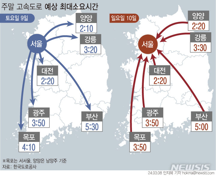 [서울=뉴시스] 이번 주말 고속도로 교통량은 대체로 맑은 날씨 속에 평소와 비슷할 것으로 예상됐다. 고속도로 정체는 주말 나들이 차량들로 경부선, 영동선, 서해안선 및 상습정체구간 위주로 다소 혼잡할 것으로 전망됐다. (그래픽=안지혜 기자)
