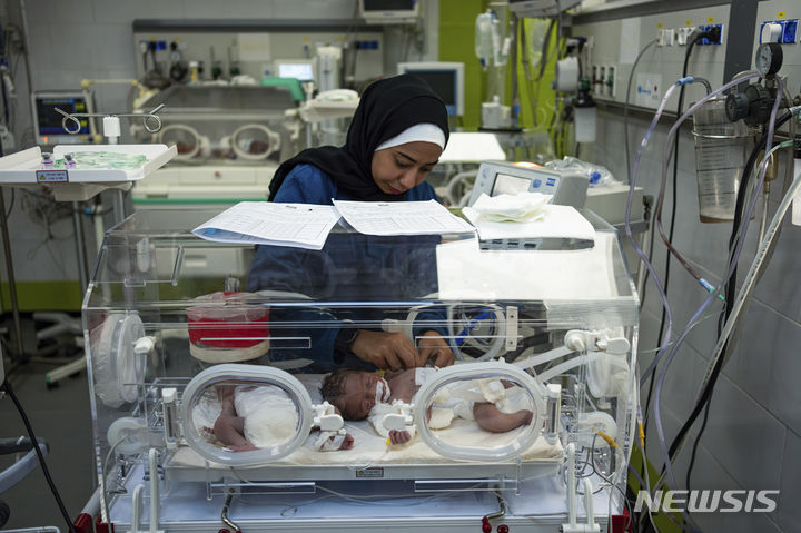 [라파=AP/뉴시스] 8일(현지시각) 가자지구 라파에 있는 에미라티 병원 조산아 병동에서 한 간호사가 인큐베이터 내 미숙아들을 돌보고 있다. 이 병원 관계자는 지난 5주 동안 16명의 미숙아가 영양실조와 관련해 숨졌다고 밝혔다. 2024.03.09.