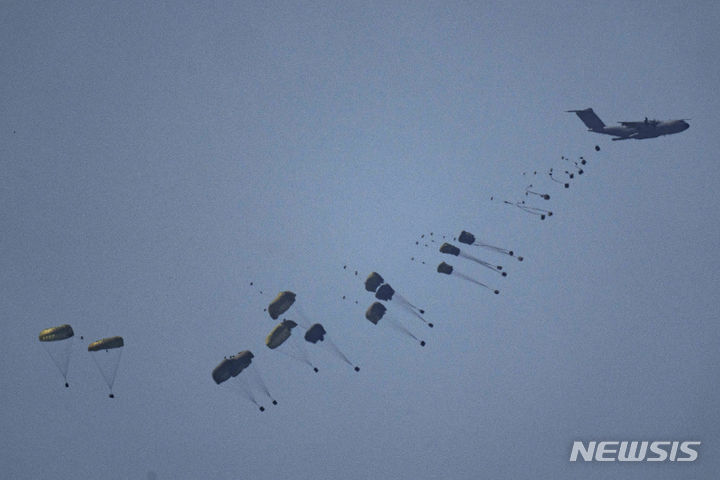 [가자지구=AP/뉴시스] 8일(현지시각) 이스라엘 남부에서 바라본 가자지구 북부 상공에서 수송기 한 대가 인도주의적 지원 물품들을 낙하산에 매달아 투하하고 있다. 2024.03.09.