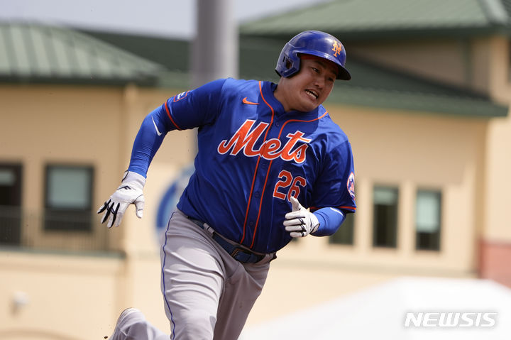 [주피터=AP/뉴시스] 뉴욕 메츠의 최지만이 9일(현지시각) 미 플로리다주 주피터의 로저 딘 쉐보레 스타디움에서 열린 2024 메이저리그(MLB) 세인트루이스 카디널스와의 경기 1회 1타점 2루타로 진루 후 후속 적시타로 득점하고 있다. 최지만은 3타수 3안타 1볼넷 1타점 1득점으로 활약하며 팀의 8-0 승리에 이바지했다. 2024.03.10.