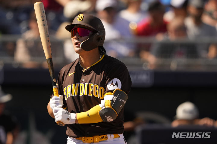 [피오리아=AP/뉴시스] 샌디에이고 파드리스의 김하성이 9일(현지시각) 미 애리조나주 피오리아 스포츠 콤플렉스에서 열린 2024 메이저리그(MLB) 시카고 화이트삭스와의 경기 4회 타석에 들어서고 있다. 김하성은 3타석 연속 삼진당하며 침묵했고 팀은 1-1로 비겼다. 2024.03.10.