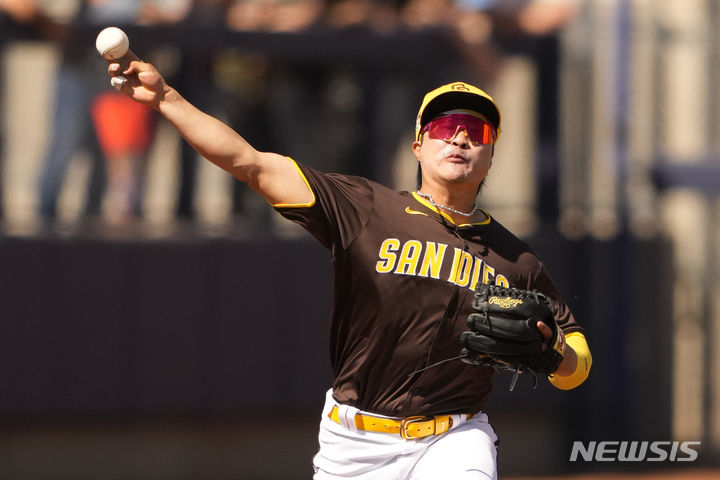 [피오리아=AP/뉴시스] 샌디에이고 파드리스 유격수 김하성이 9일(현지시각) 미 애리조나주 피오리아 스포츠 콤플렉스에서 열린 2024 메이저리그(MLB) 시카고 화이트삭스와의 경기 4회 수비하고 있다. 김하성은 3타석 연속 삼진당하며 침묵했고 팀은 1-1로 비겼다. 2024.03.10.