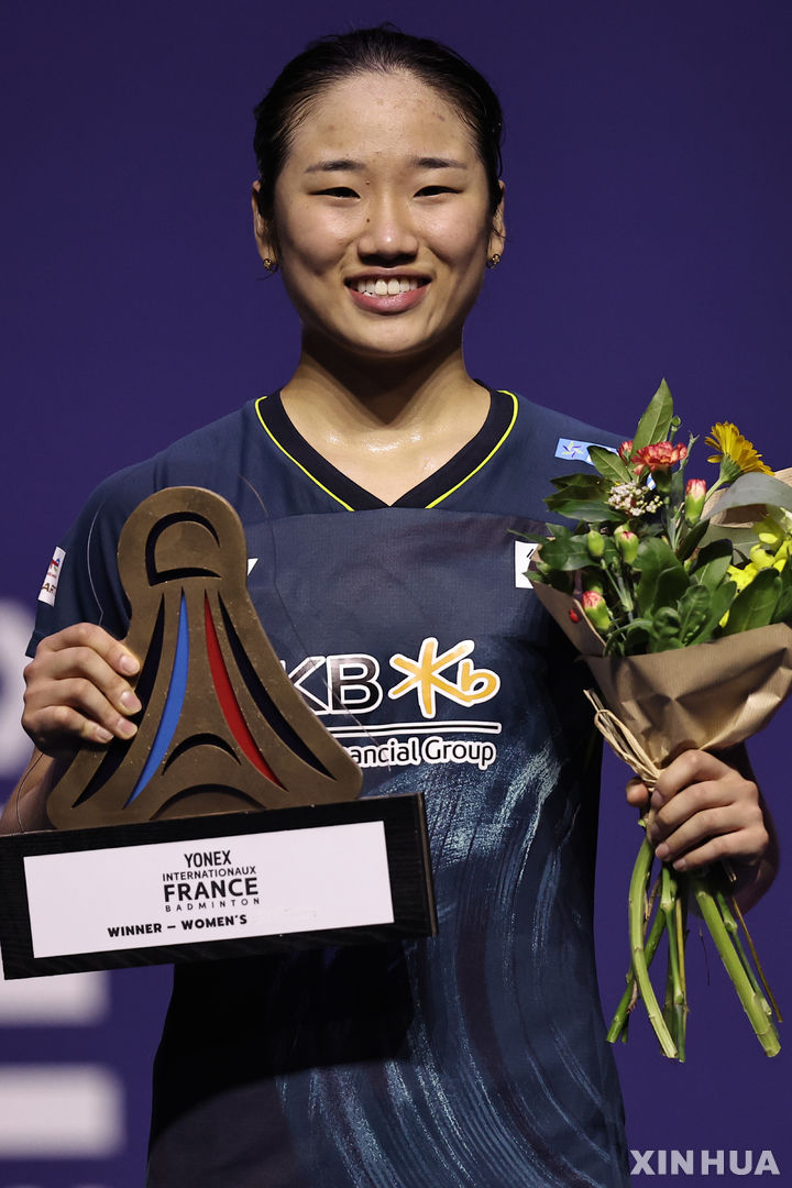[파리=신화/뉴시스] 안세영(1위)이 10일(현지시각) 프랑스 파리의 포르트 드 라 샤펠 아레나에서 열린 세계배드민턴연맹(BWF) 월드투어 슈퍼 750 프랑스 오픈 여자 단식 정상에 올라 트로피를 들고 포즈를 취하고 있다. 안세영은 결승전에서 야마구치 아카네(2위·일본)에게 2-1(18-21 21-13 21-10) 역전승을 거두고 우승을 차지했다. 2024.03.11.