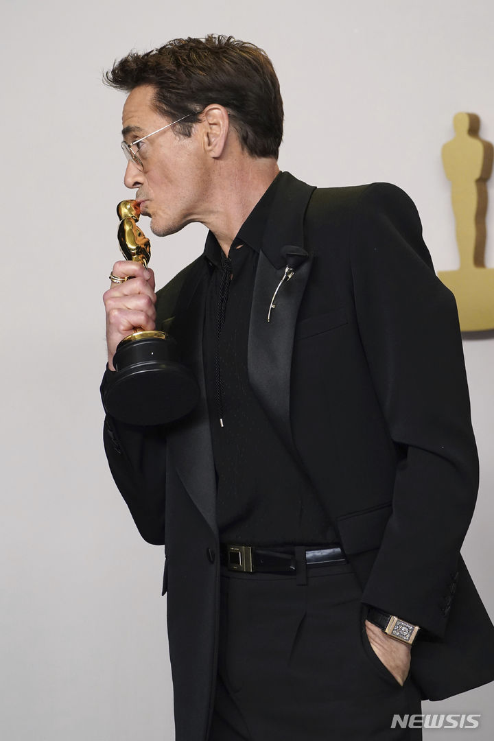 [로스앤젤레스=AP/뉴시스] 배우 로버트 다우니 주니어가 10일(현지시각) 미 캘리포니아주 로스앤젤레스의 돌비극장에서 열린 제96회 아카데미 시상식에서 영화 '오펜하이머'로 남우조연상을 받은 후 프레스룸에서 트로피에 입 맞추고 있다. 2024.03.11.