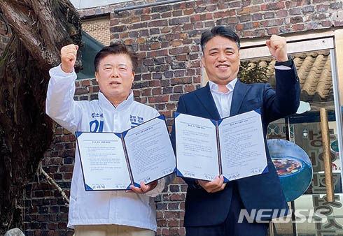 [무안=뉴시스] 송창헌 기자 = 제22대 총선 전남 담양·함평·영광·장성 선거구에 출마한 더불어민주당 박노원(오른쪽) 예비후보와 무소속 이석형 예비후보사 지난 8일 무소속 단일화에 합의한 뒤 화이팅을 외치고 있다. (사진=이석형 예비후보 측 제공) 2024.03.11 [email protected]