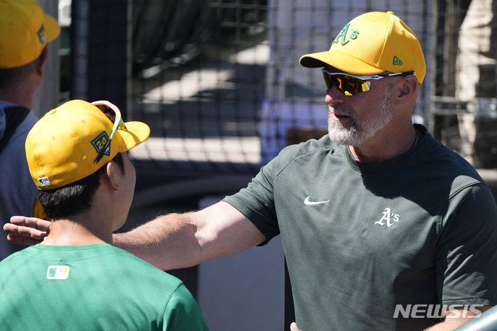 [스코츠데일=AP/뉴시스] 오클랜드 애슬레틱스의 박효준(왼쪽)이 11일(현지시각) 미 애리조나주 스코츠데일의 솔트리버필드 앳 토킹스틱에서 열리는 2024 메이저리그(MLB) 시범 경기 애리조나 다이아몬드백스와의 경기에 앞서 마크 캇세이 감독과 얘기를 나누고 있다. 박효준은 8번 타자 우익스로 선발 출전해 3타수 2안타 1득점 1도루를 기록했고 팀은 6-5로 승리했다. 2024.03.12.