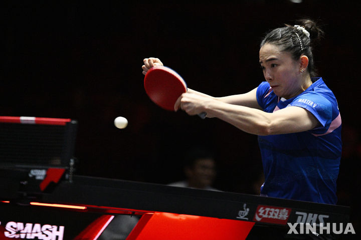 [싱가포르=신화/뉴시스] 전지희가 12일(현지시각) 싱가포르 스포츠 허브에서 열린 월드테이블테니스(WTT) 싱가포르 스매시 2024 여자 단식 2라운드에서 천멍(중국)과 경기하고 있다.  전지희는 0-3(9-11 8-11 8-11)으로 완패해 16강에 오르지 못했다. 2024.03.13.