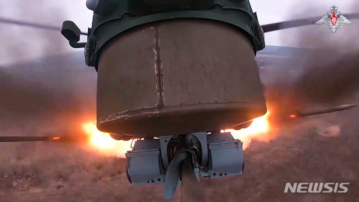 [도네츠크=AP/뉴시스] 러시아 국방부가 공개한 사진에 12일(현지시각) 러시아군의 Mi-28 공격 헬기 한 대가 우크라이나의 미공개 장소에서 로켓을 발사하고 있다. 2024.03.13.