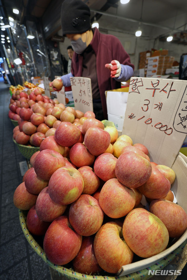 [서울=뉴시스] 김금보 기자 = 13일 서울 동대문구 청량리청과물시장에 사과 상품이 진열돼 있다. 한국농수산식품유통공사(aT) 농산물유통정보에 따르면 전날 사과(후지·상품) 10kg당 도매가격은 9만1천700원을 기록, 작년(4만1천60원)과 비교하면 123.3%나 올랐다. 2024.03.13. [email protected]