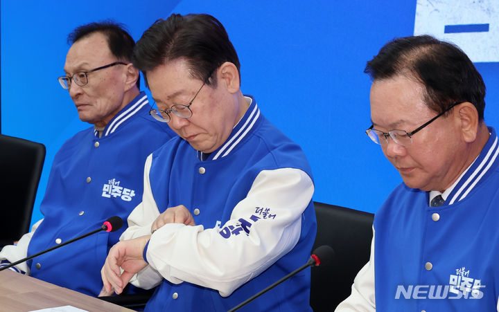 [서울=뉴시스] 이영환 기자 = 이재명 더불어민주당 상임공동선거대책위원장이 13일 오전 서울 여의도 중앙당사에서 열린 제2차 중앙선거대책회의에 참석해 시계를 보고 있다. 2024.03.13. [email protected]