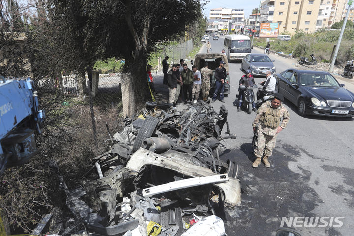 [티레=AP/뉴시스] 13일(현지시각) 레바논 티레 남부 외곽에서 레바논 군인들이 차량 파괴 현장을 조사하고 있다. 레바논 남부 티레 인근에서 이스라엘군 드론의 표적 공격으로 하마스 대원 1명과 동승자 최소 1명이 숨진 것으로 알려졌다. 2024.03.14.