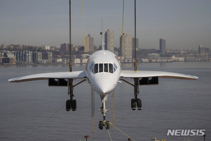 [뉴욕=AP/뉴시스] 14일(현지시각) 미국 뉴욕에서 브리티시 에어웨이의 콩코드 초음속 여객기가 크레인에 실려 인트레피드 해양항공우주박물관으로 옮겨지고 있다. 이 여객기는 지난 1996년 뉴욕과 런던을 2시간52분59초 만에 비행, 여객기 세계 최고 속도 기록을 보유하고 있다. 박물관 전시 중이던 지난해 8월 9일 복구를 위해 브루클린 해군기지로 옮겨진 후 약 7개월간의 복원 과정을 거쳐 복귀했다. 여객기는 다음 달 4일부터 일반에 공개된다. 2024.03.15.