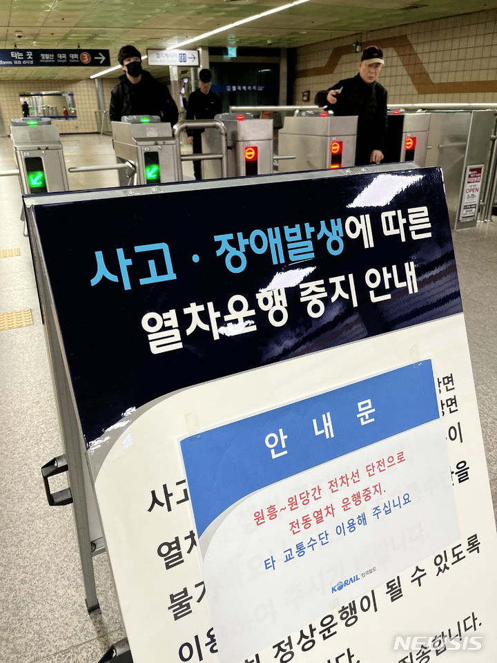 [고양=뉴시스] 배훈식 기자 = 15일 오전 지하철 3호선 원당~원흥역 구간이 단전으로 1차선만 운행되는 차질이 빚어지고 있다. 이날 경기도 고양시 화정역에 관련 안내문이 붙어 있다. 2024.03.15. [email protected]