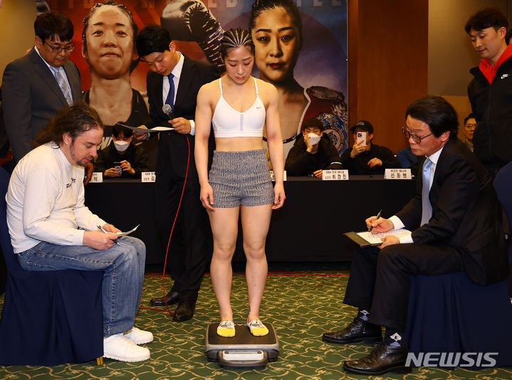 [서울=뉴시스] 김근수 기자 = 일본 요시카와 리유나가 15일 서울 서대문구 스위스그랜드호텔에서 WIBA 미니멈급 세계타이틀 매치를 하루 앞두고 계체량 측정을 하고 있다. 2024.03.15. [email protected]