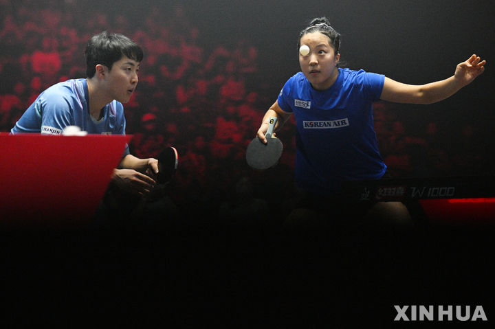 [싱가포르=신화/뉴시스] 신유빈-임종훈 조(3위)가 15일(현지시각) 싱가포르 스포츠 허브에서 열린 월드테이블테니스(WTT) 싱가포르 스매시 2024 혼합 복식 결승전에서 왕추친-쑨잉사 조(1위·중국)와 경기하고 있다. 한국이 1-3(7-11 8-11 11-9 7-11)으로 패하며 만리장성을 넘지 못했다. 2024.03.16.