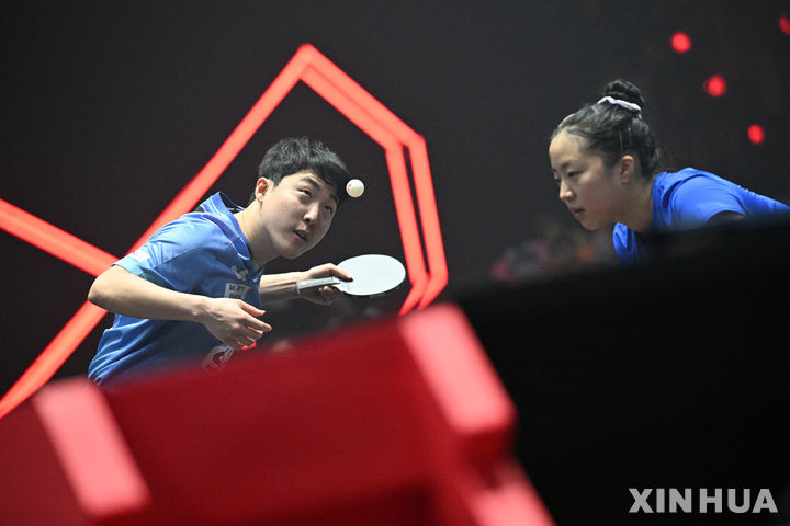 [싱가포르=신화/뉴시스] 신유빈-임종훈 조(3위)가 15일(현지시각) 싱가포르 스포츠 허브에서 열린 월드테이블테니스(WTT) 싱가포르 스매시 2024 혼합 복식 결승전에서 왕추친-쑨잉사 조(1위·중국)와 경기하고 있다. 한국이 1-3(7-11 8-11 11-9 7-11)으로 패하며 만리장성을 넘지 못했다. 2024.03.16.
