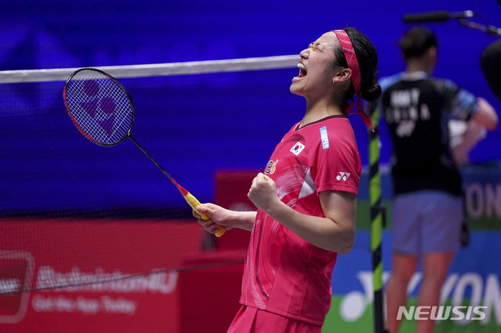[버밍엄=AP/뉴시스] 안세영(1위)이 15일(현지시각) 영국 버밍엄의 유틸리타 아레나에서 열린 세계배드민턴연맹(BWF) 월드투어 전영오픈 여자 단식 8강전에서 한웨(8위·중국)을 물리친 후 환호하고 있다. 안세영이 2-0(21-16 21-19)으로 승리하고 무난히 4강에 올라 야마구치 아카네(4위·일본)와 결승 진출을 다툰다. 2024.03.16.