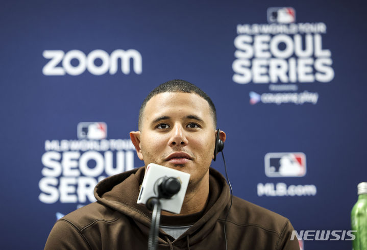 [서울=뉴시스] 정병혁 기자 = 16일 서울 구로구 고척스카이돔에서 열리는 메이저리그(MLB) 월드투어 서울시리즈에 참가하는 샌디에이고 파드리스 매니 마차도가 취재진 질문에 답하고 있다. 2024.03.16. [email protected]