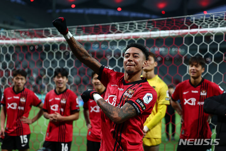 [서울=뉴시스] 김근수 기자 = 16일 서울 마포구 서울월드컵경기장에서 열린 하나원큐 K리그1 2024 3라운드 FC서울와 제주유나이티드의 경기에서 FC서울이 2대0 승리를 거뒀다. FC서울 제시 린가드가 팬들에게 승리 세리머니를 하고 있다. 2024.03.16. [email protected]