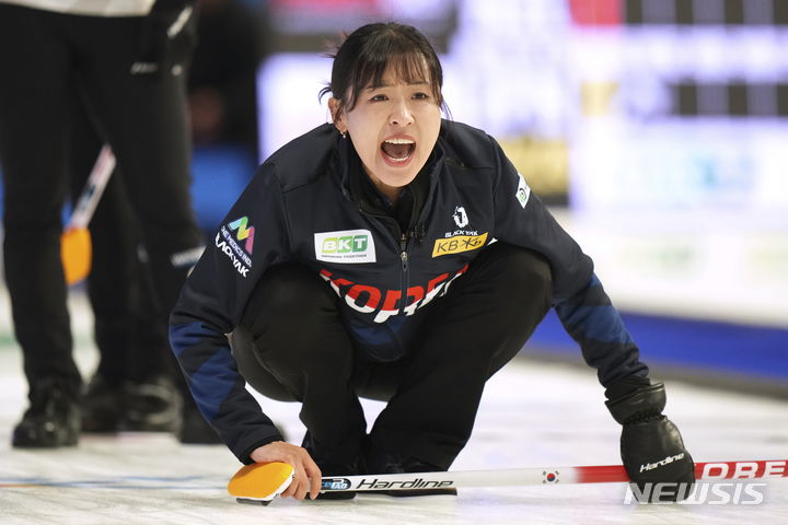 [시드니=AP/뉴시스] 여자 컬링 '팀 5G'의 스킵 김은지가 16일(현지시각) 캐나다 노바스코샤주 시드니에서 열린 2024 세계 여자컬링 선수권대회 리그 1차전 스위스와 경기 중 스톤을 던진 뒤 고함치고 있다. 한국이 4-7로 패해 1패를 기록했다. 2024.03.17.