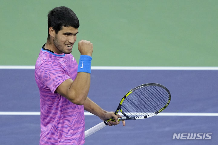 [인디언웰스=AP/뉴시스] 카를로스 알카라스(2위·스페인)가 16일(현지시각) 미 캘리포니아주 인디언웰스에서 열린 남자프로테니스(ATP) 투어 BNP 파리바 오픈 단식 준결승전에서 얀니크 신네르(3위·이탈리아)를 물리친 후 환호하고 있다. 알카라스가 2-1(1-6 6-3 6-2)로 역전승하고 결승에 올라 2연패를 노리게 됐다. 2024.03.17.